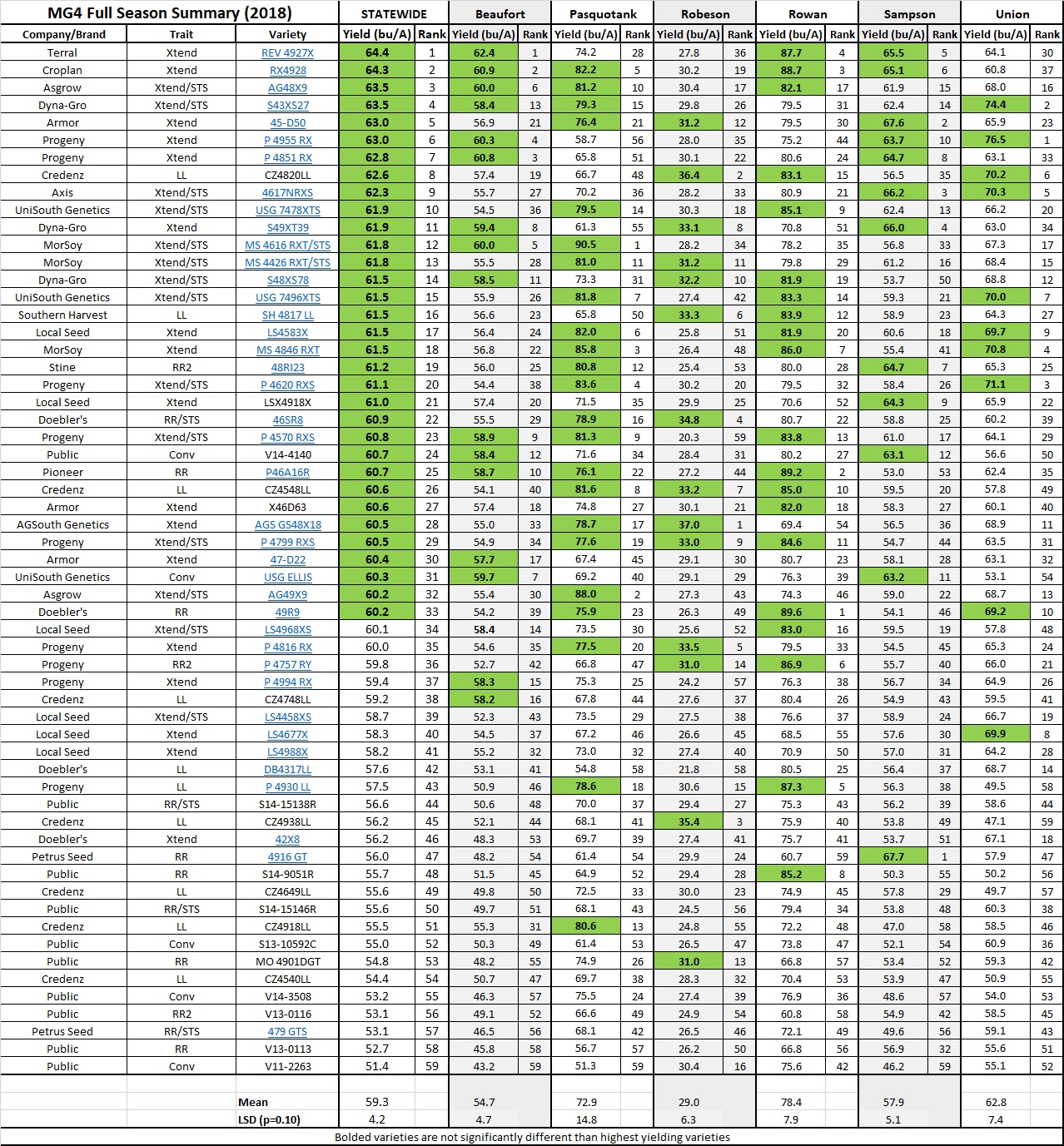 Each hybrid name in this table and the linked PDF are hyperlinked. Clicking on the link will take you to the tech sheet or seed guide for that hybrid if it exists. This is included in order to provide more characteristic information for each hybrid. The inclusion of these links does NOT indicate a preference for or recommendation of any hybrid by NC State University, nor is NC State University responsible for the upkeep and content of those tech sheets.